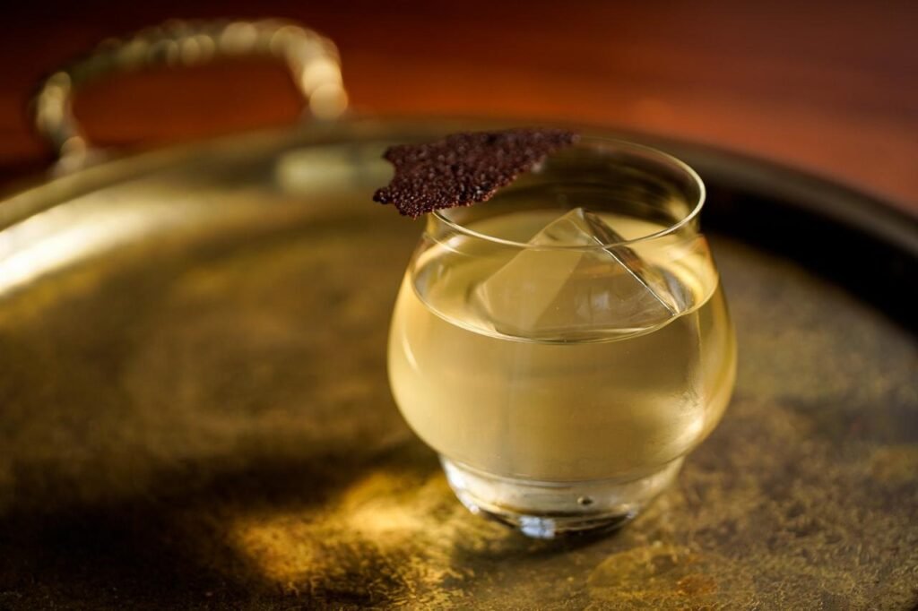 Um dos destaques absolutos da carta do Kairu é o Cupuaçu Punch, coquetel assinado por Emanuel Dantas que une técnica contemporânea, ingredientes brasileiros e uma estética sensorial marcante.